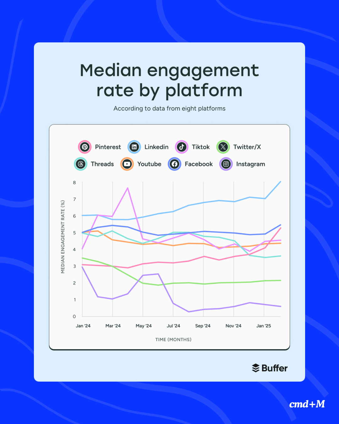 📉 Instagram fällt weiter zurück – von 2,94 % auf nur noch 0,61 % im Median. Aber: Die Interaktionen wandern hinter die Kulissen. Shares, DMs und Saves zählen immer mehr – auch wenn sie in klassischen Engagement-Metriken nicht auftauchen. Sprich: Content sollte speicherbar, teilbar oder direkt verschickbar sein.
