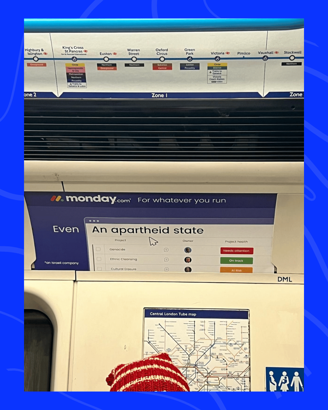 Statt des üblichen „Work-Management“-Slogans zeigt das manipulierte Plakat ein Dashboard mit dem Titel „An apartheid state“, darunter Projekte wie „Genocide“ und „Ethnic Cleansing“. Unten links steht klein: „an Israeli company“.