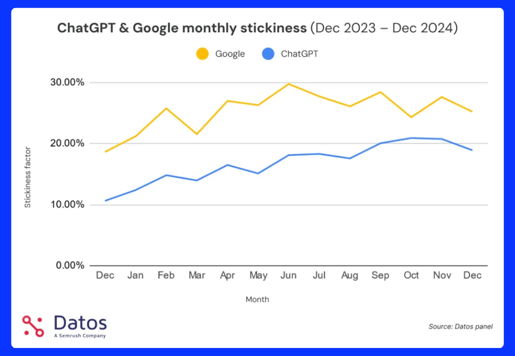 ABER: ChatGPT wächst schneller als Google und zeigt eine steigende Nutzerbindung (Stickiness-Faktor*: +8,29 % bei ChatGPT vs +6,56 % bei Google in 2024).