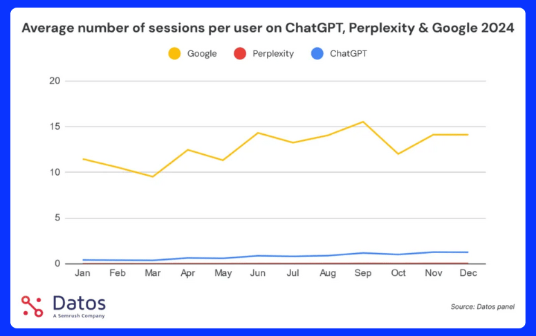 Doch so groß das Wachstum von ChatGPT auch ist – Google bleibt unangefochten. Während ChatGPT-Nutzer im Schnitt nur 1,27 Such-Sessions pro Monat durchführen, sind es bei Google 14,12.