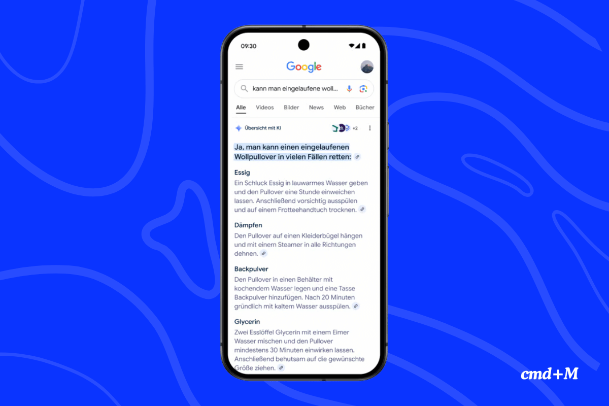 Google hat seine Suchmaschine über Nacht grundlegend verändert: In Deutschland und sieben weiteren EU-Ländern gibt es jetzt offiziell die „Übersicht mit KI” – auf Englisch “AI-Overviews.” Statt direkt auf Linklisten zu stoßen, bekommt man nun zuerst eine generative Antwortbox angezeigt – natürlich KI-basiert.