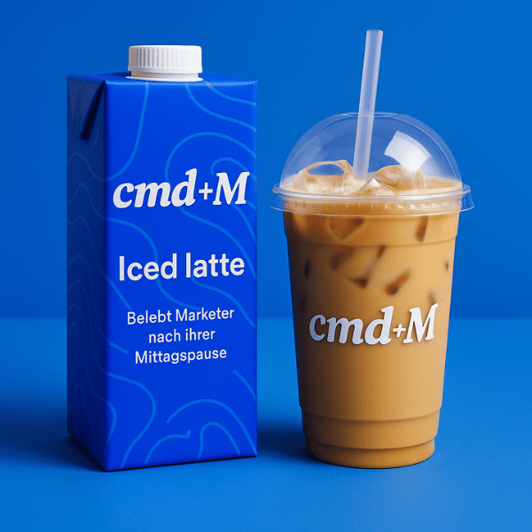 “Generiere mir ein Bild, als würde ich mit meiner Newsletter Marke "cmd+M" einen eigenen Iced Latte rausbringen. Auf dem Bild sollte man eine cmd+M Verpackung sehen mit folgender Beschriftung: "cmd+M Iced latte - Belebt Marketer nach ihrer Mittagspause". Daneben sollte ein Iced Latte Becher stehen auf dem ebenfalls cmd+M gebranded ist. Nutze bitte folgende Ressourcen für das Bild: - Du kannst dich an allem auf dieser Landing Page bedienen: http://cmd.beehiiv.com - Die Main Brand Color ist folgendes blau: #0A34FF Und hier sind unterschiedliche Logo Varianten von cmd+M. Das Blaue ist das Main logo”