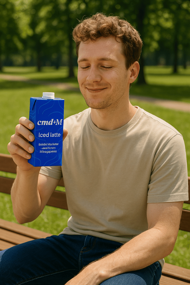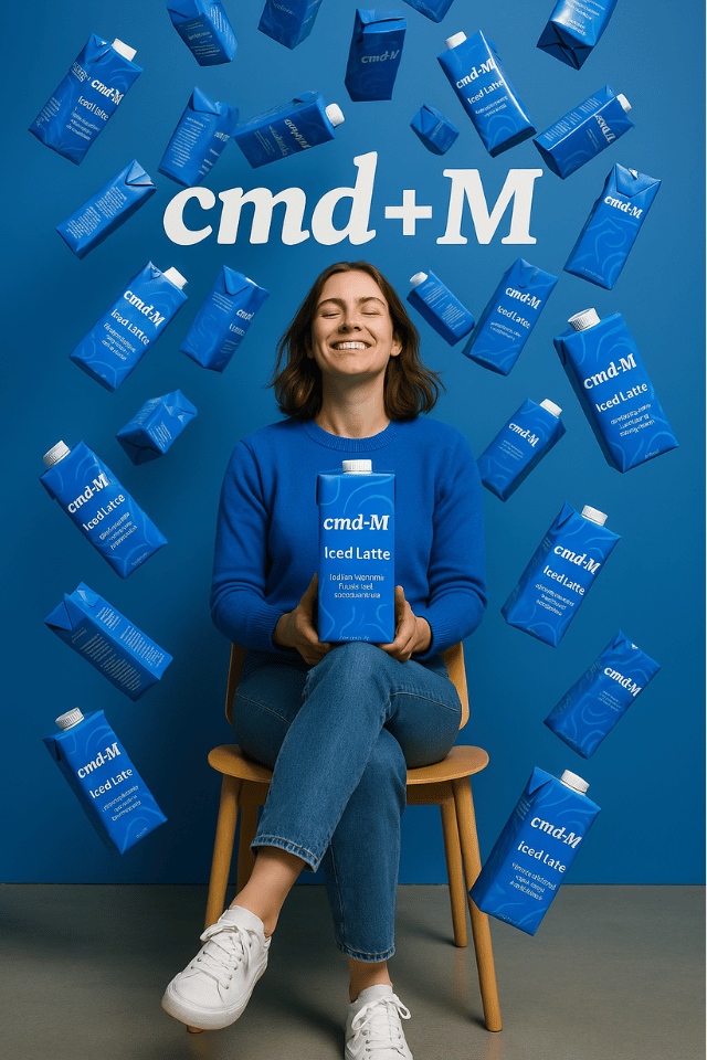 Generiere mir ein Bild, als würde ich mit meiner Newsletter Marke "cmd+M" einen eigenen Iced Latte rausbringen. Auf der cmd+M Verpackung des Iced Latte sollte man folgende Beschriftung sehen: "cmd+M Iced Latte - Belebt Marketer nach ihrer Mittagspause". Das foto soll aber nach einem professionellen Foto-Shooting aussehen. Ich stelle mir folgende Szenerie vor: Eine Person sitzt in einem leeren Raum auf einem Stuhl. Von oben "regnet" es die blauen Iced-Latte Tetra-Packs auf die Person. Stell dir vor das ist ein Foto für ein großes Werbeposter des cmd+M Iced Latte. Nutze bitte folgende Ressourcen für das Bild: - Du kannst dich an allem auf dieser Landing Page bedienen: http://cmd.beehiiv.com - Die Main Brand Color ist folgendes blau: #0A34FF - ich habe dir auch ein Bild angehängt wie der Iced Latte Tetra Pack aussehen kann. Und hier sind unterschiedliche Logo Varianten von cmd+M. Das Blaue ist das Main logo